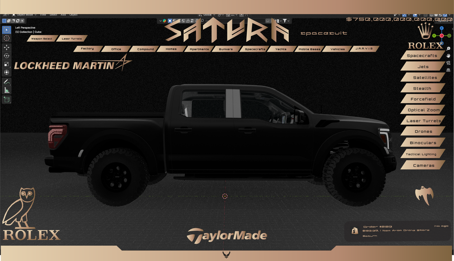 This fully custom E-tron is equipped with the custom saturn car software to login to the home at any time from anywhere. Highly powerful and feels like a true spaceship, this vehicle is part of the 5 vehicle fleet that comes standard with any saturn home.