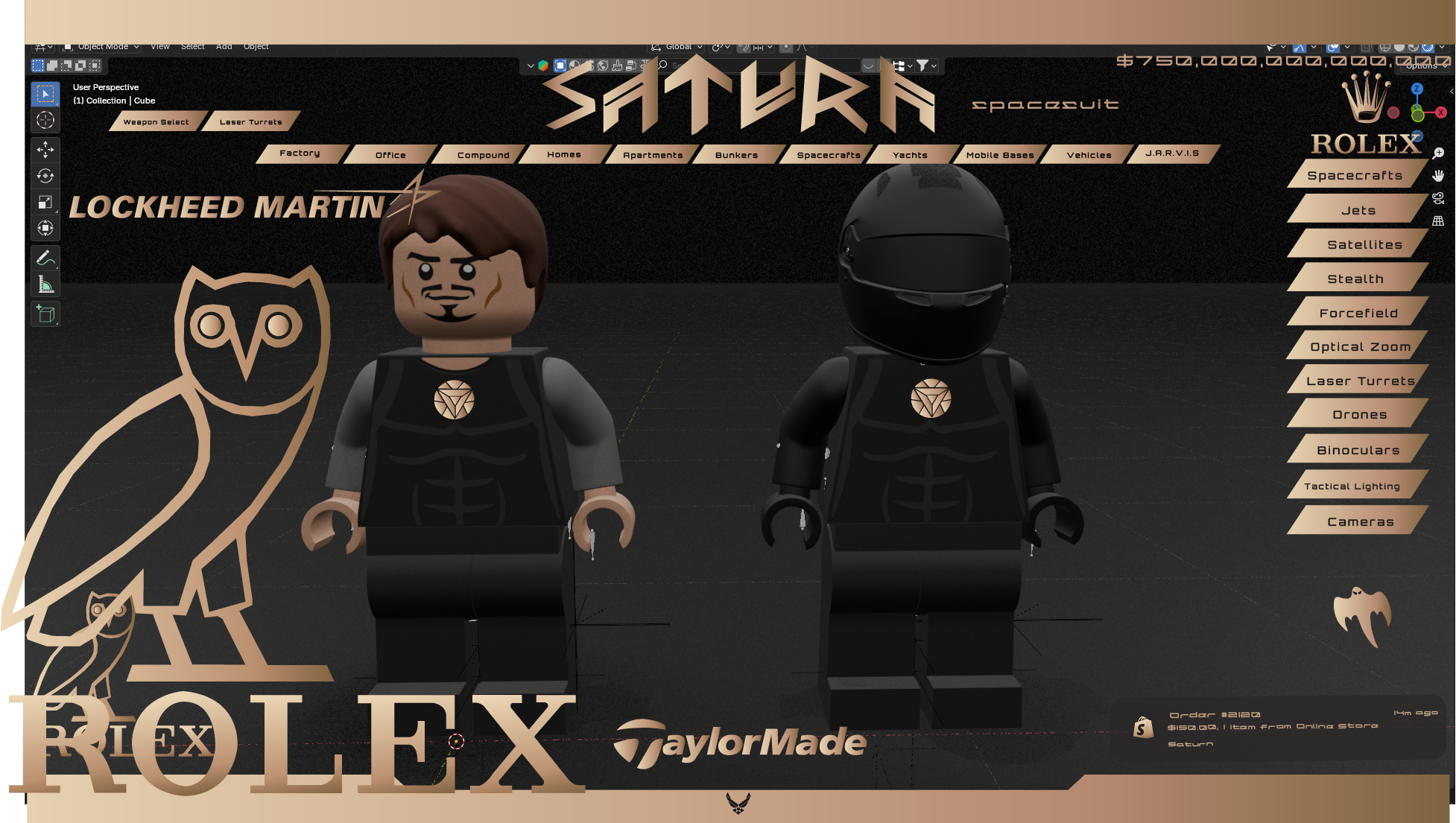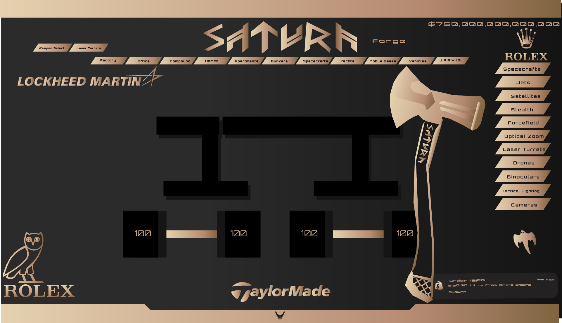 Custom Forged carbon fiber 24k gold spacesuit with highly advanced technology, AI control system, flight systems, weapons, drone, cameras, tactical lighting, binoculars, maelstrom axe, and more