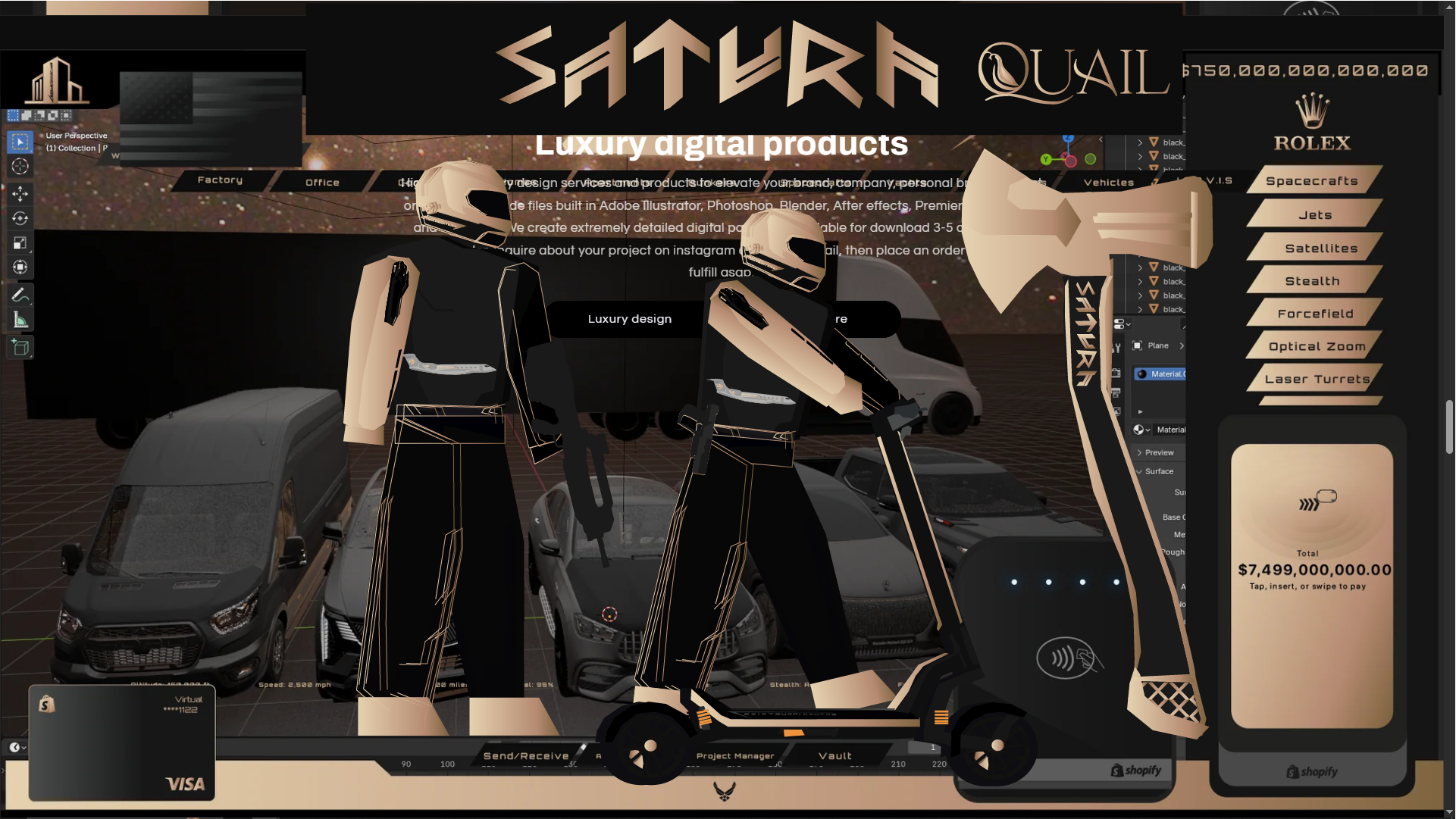 High quality luxury design services and products to elevate your brand, company, personal brand, project or more. We include files built in Adobe Illustrator, Photoshop, Blender, After effects, Premiere Pro, Figma and FL Studio. We create extremely detailed digital packages available for download 3-5 days after a service order. Inquire about your project on instagram or through email, then place an order and we will fulfill asap.