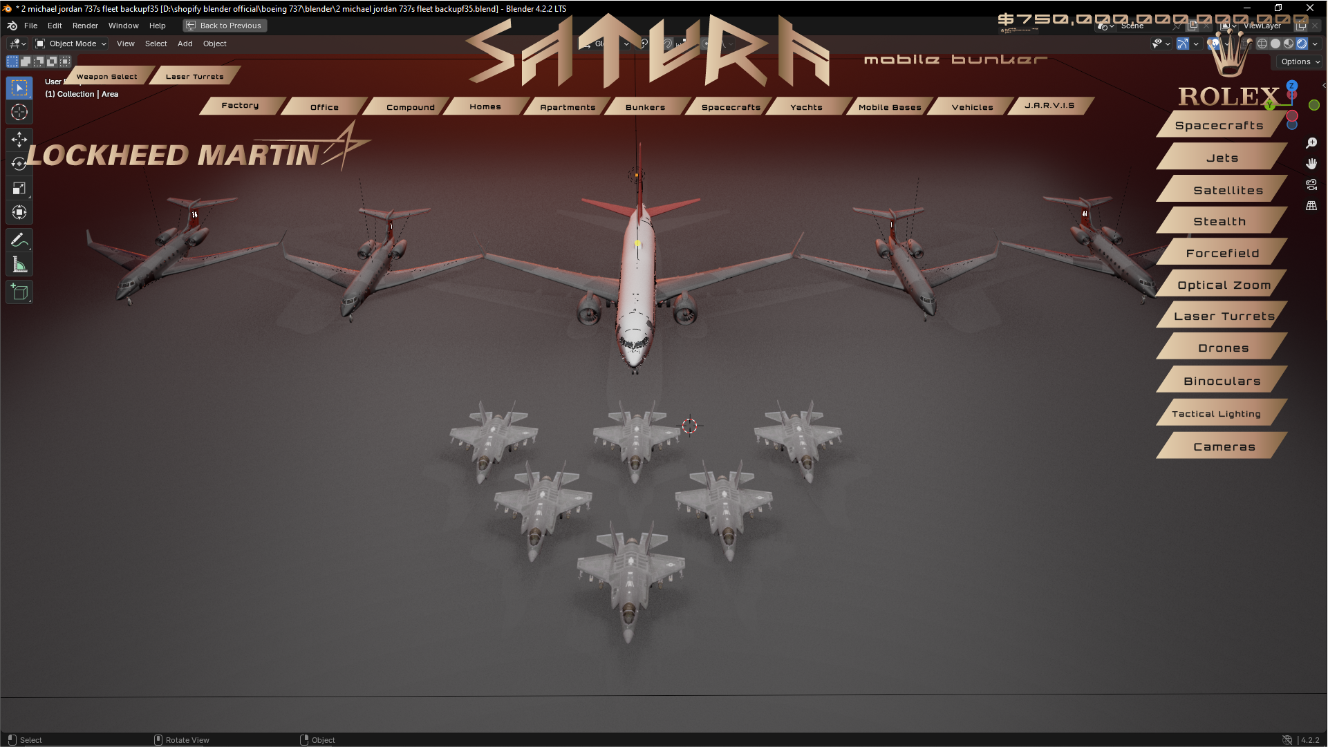 Equipped with highly advanced stealth technology, this spaceship has active camo, forcefields, overshield, laser turrets, missile defense, bugatti hab vehicle, 5 spacesuits and more. Can travel through deep space and has built in portal.